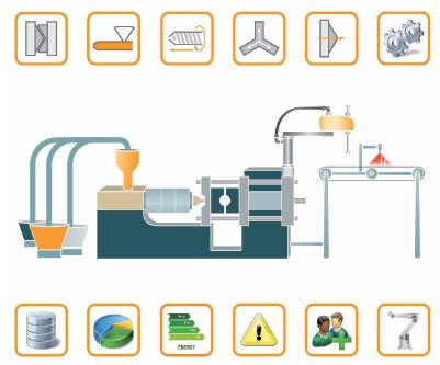 显示了注塑机、机器人与生产配料、称重系统的配合,当生产工艺变化时,配料与称重与机器配合,并实现软件自定义的工艺变化,与机器人、输送系统共同构成一个“智能塑料加工单元”,形成高效的连续生产,整体提高塑料件的制造效率。
